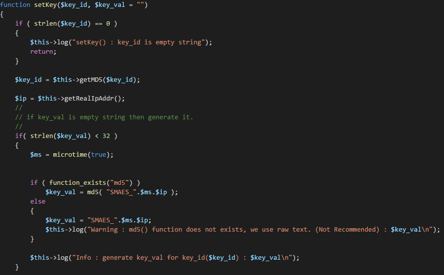 SMAES also provides functionality for the client and server to synchronize to new, random encryption keys. This is performed via the SMKey.syncKey() and syncKey.php on the client and server respectfully. During this process, the server will generate a new encryption key and send it back to the client. The new key will be the md5 hash of a timestamp and the clients IP address. Unfortunately, there is a critical issue in this functionality, as discussed in Device ID as Encryption Key.